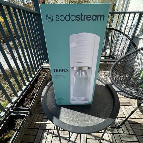 SodaStream Terra. Innehåller sodastream, en kolsyrepatron och 5 flaskor i olika storlekar (3 x 1 liter och 2 x 0,5 liter).