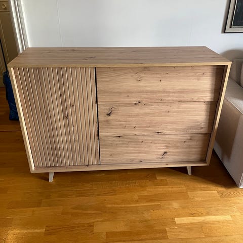 Sideboard i ek med svart metallram, en låda, ett skåp med dörr och öppna hyllor. Bra med förvaring både bakom dörren och i facken på sidorna.