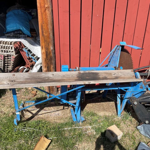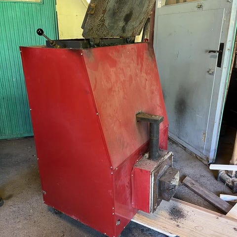 Leksandskapen med rullbänk och 2 st. klingor varav en är nyslipad på verkstad. Vagn under kapen.