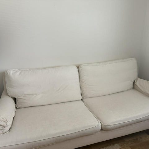 Väldigt fin howardsoffa (2 sittkuddar, 2 ryggkuddar) i grå klädsel. En klassisk, lätt svängd, väldigt vacker och elegant howard soffa med stilrena utsvängande ben! Soffan är i bra skick men ena kudden har det lätt gått hål i, men som är lagat så det inte knappast syns, utöver det inga skador eller fläckar. Klädseln på kuddarna är avtagbar och väl rengjorda och tvättade inför försäljningen.