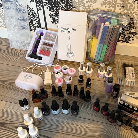 Depend Gel iQ kit med UV-lampa, flera gel-lackflaskor och manual. Några olika färger och bas/överlack ingår i flaskorna som syns, plus lösnaglar i förpackning.
