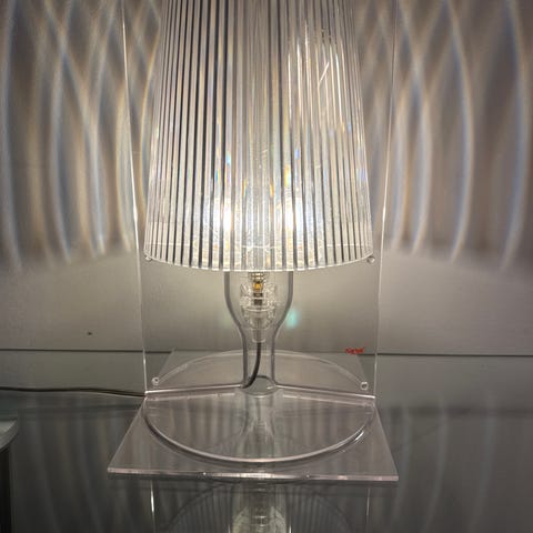 Fin bordslampa från Kartell med en illusion av två ljuskällor i. Foten har en mindre repa. Lampskärmens insida har en plissérad yta som sprider ett dekorativt ljus när den är påslagen.