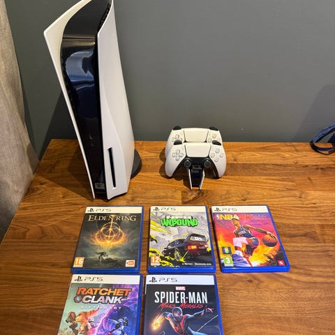 Playstation 5 konsol med discläsare köpt 2021. Allt funkar som det ska. Alla kablar följer med och Elden ring. Original kontrollen följer också med men den har stickdrift. Kom med bud!