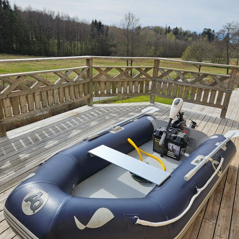 En stabil och behändig uppblåsbar ”Jolle”/gummibåt med en Hondamotor 2,3, fyrtaktare. Båten är ca 2,25 m lång, 1,31 m bred, avsedd för 2,5 person. Maxlast 250 kg, sittbräda, åror och golv med slitsar för stabilitet.
