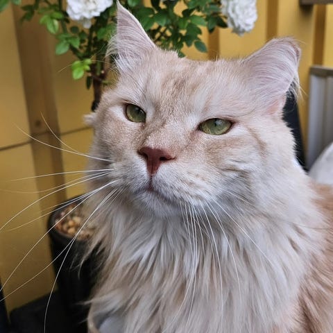 Elsa är en enkel katt att ta hand om och äter idag torrfoder, vilket hon mår bra av och trivs med.