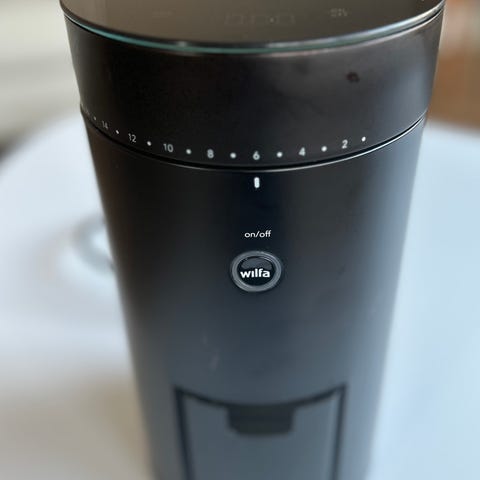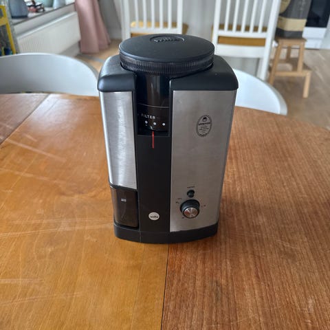 Wilfa kaffekvarn med justerbart malningsreglage och tydlig knapp på framsidan. Har bönbehållare upptill och behållare för malet kaffe framtill.