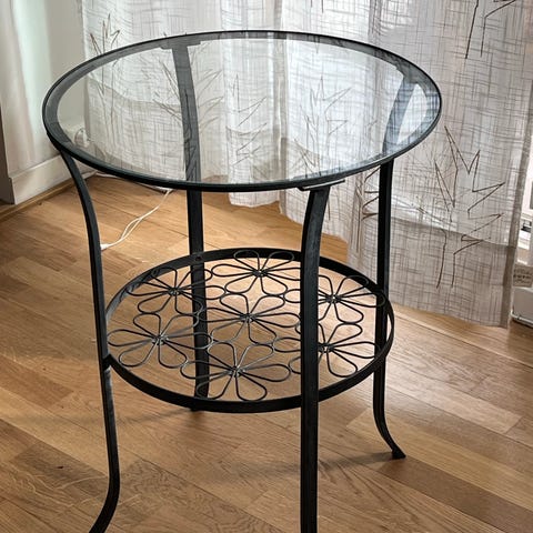 Rund glasskiva, designer Cecilia Stööp, svart metallstomme, hylla med blommönster, höjd 62 cm, diameter på glasskivan 48 cm.