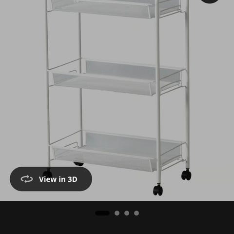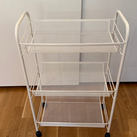 Vit rullvagn från IKEA med tre korgar/hyllplan i metallnät. Står på hjul som går att låsa och är lätt att flytta runt. Lätt slitage, se bild för skick.