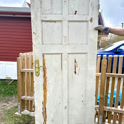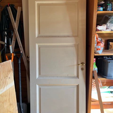 Vit innerdörr med klassisk spegelindelning och mässingsfärgat handtag.