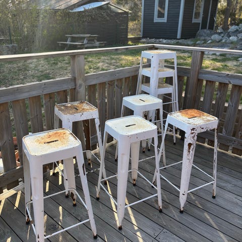2 vita barpallar i metall med fyrkantigt säte. Stabil modell med fotstöd runt om och enkel öppning upptill i sitsen. Man kan se litegrann rost i någon skarv, annars fina.