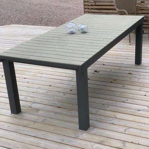Grått matbord från Jysk, Jutlandia, med skiva i brädlook och mörk stomme i metall. Rektangulär modell som står stadigt på fyra raka ben. En synlig repa i metallen, se bild, därav pris.