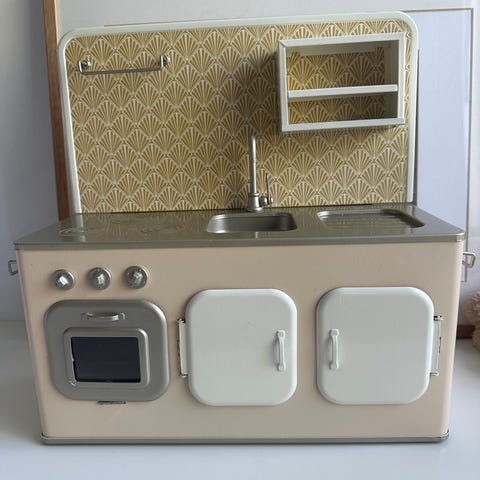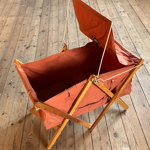 Barnstrykbräda i trä med stoppad dyna för strykning. Det följer med ett strykjärn i plåt med trähandtag samt en tvättkorg och klädnypor 6st.