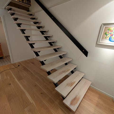 Platsbesparande inomhustrappa med steg i trä och vit metallstomme. Har räcke med vertikala stolpar och skruvade fästen mellan stegen. Passar fint i stuga med loft / övervåning. 11 trappsteg, passar till takhöjd 2,65