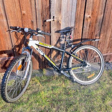 BMX-cykel med 24" hjul i unisexmodell, ramstorlek L. Har grova däck, handbromsar fram och bak samt växlar på styret.