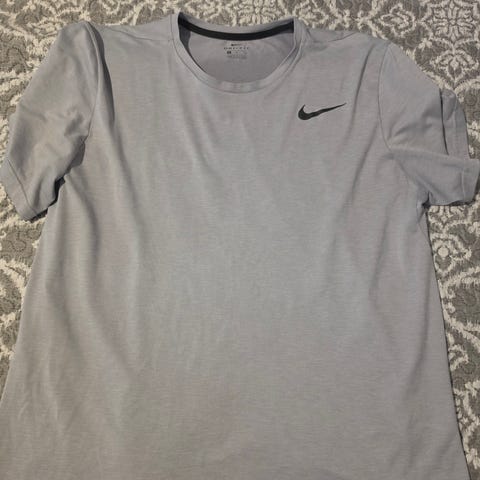 Säljer en vit Nike Dri-Fit t-shirt i storlek 3XL. T-shirten har korta ärmar, rund halsringning och är tillverkad i ett lätt och ventilerande material med sma häl för extra andningsförmäga. Nike-logga på bröstet för en sportig look.