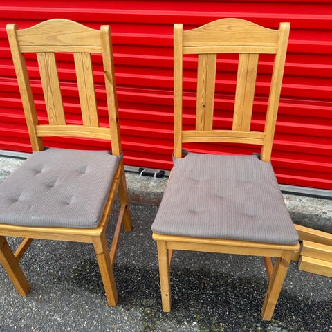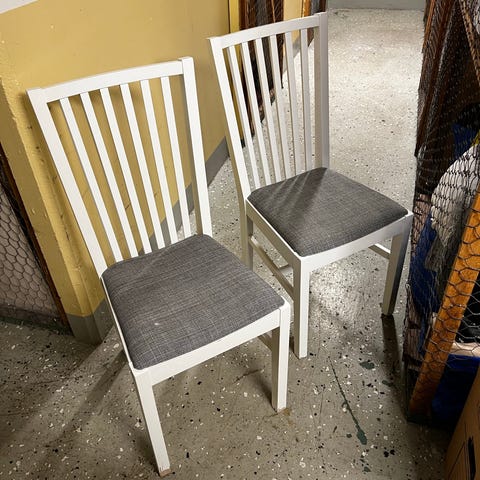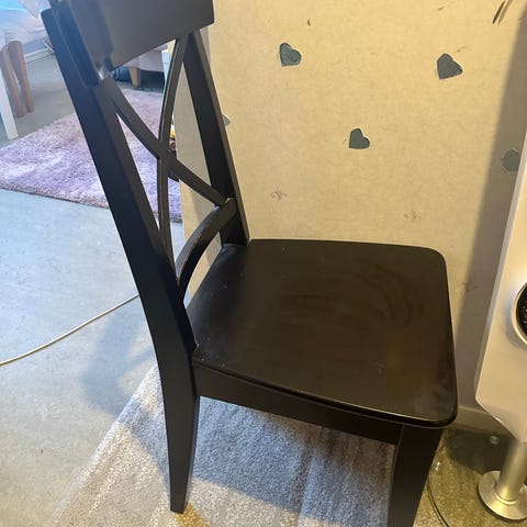 2 stycken svarta ingolf stolar + 2 stycken gråa justina dynor. Allt från ikea.