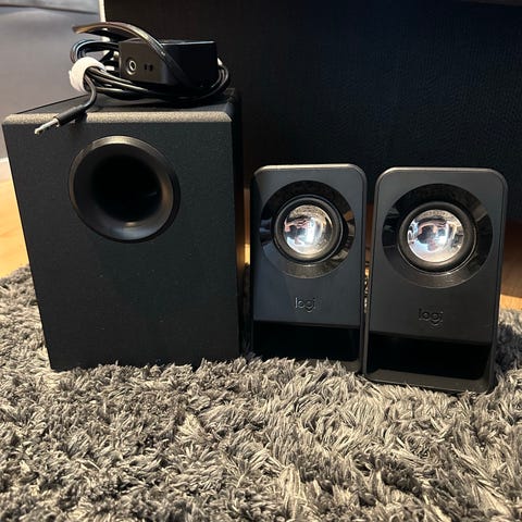 Logitech 2.1-högtalarsystem med två satelliter och subwoofer, svart med kopparfärgade element. Har separat volymkontroll med ratt för enkel justering. Högtalarna och subwooferna funkar utan problem och låter bra. Det finns dock lite små märken som endast är synliga på högtalarna ifall man kollar noggrant men är inget som stör eller påverkar funktionen.