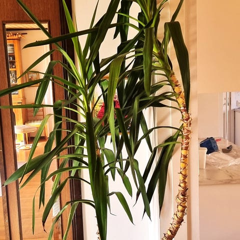 Stor grön palm i dekorativ korgkruka. Fin som inomhusväxt och ger mycket grönska i rummet. Lite bruna/torra bladtoppar, men i övrigt mår den bra.