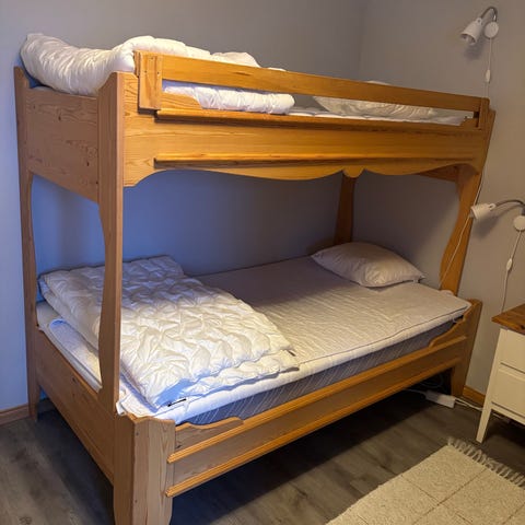 IKEA våningssäng i trä med stege på kortsidan. Passar madrasser ca 90x200 och har höga sidor uppe för extra skydd. Madrass och sänglampa ingår.