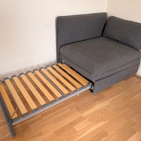 I svart konstläder. Har beigt överdrag. Bäddas ut till säng. Bäddsoffa.
