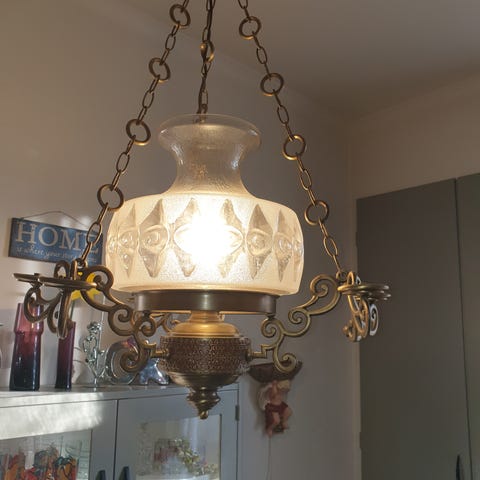 Taklampa från &Tradition designad av Wilhelm Lauritzen med glaskupa och kedjeupphängning. Har flera dekorativa metallarmar med plats för ljus runt kupan.