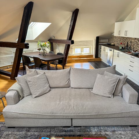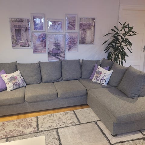 Tyget heter Alex grey och är väldigt slitstarkt men mjuk och behaglig. Rejäl stoppning som är mjuk men formbar och fyllig.