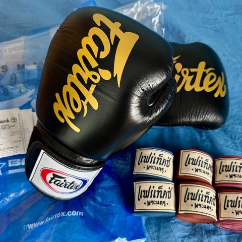 Pair of bearly worn Fairtex premium gloves. Especially famous within Thaiboxning. 16.oz