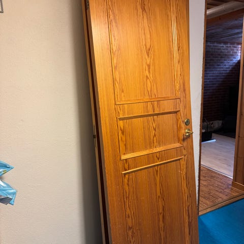 Träinnerdörr (Högerhängd)med två stora glaspartier och metallhandtag. Fint men använt skick. Kommer från hus som är byggt 1967. Märke: Svenska Dörr i Åstorp. Mått höjd:201cm bredd: 92,5cm tjocklek: 4cm.