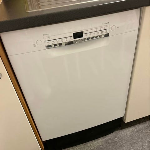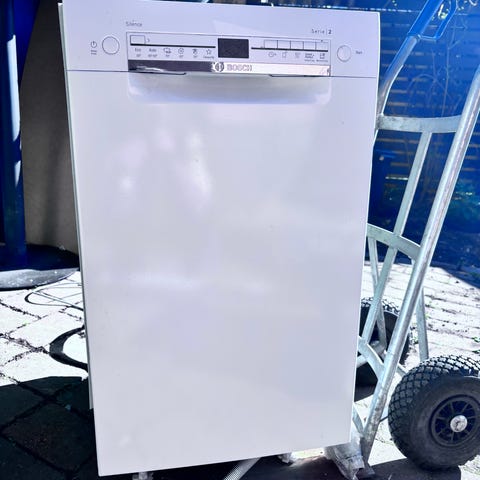 Bosch diskmaskin i vitt utförande med frontpanel och vred för programval. Invändigt finns två korgar och bestickkorg samt slangar som syns på bilderna.