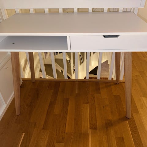 Skrivbord från Jysk med vit skiva, en låda och ett öppet fack. Ben i trä som ger bra höjd för stol och benplats under bordet.