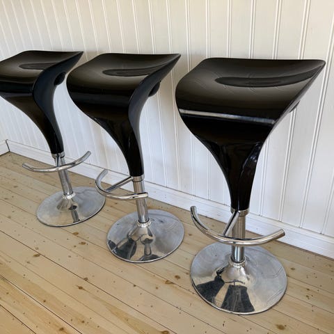 Barstolar i ek med brunt konstskinn i bruksskick. Skickas ej.