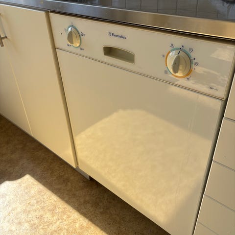 Underbyggd diskmaskin från Electrolux i vitt med frontpanel och display upptill. Standardbredd för köksskåp och med slangar ovanpå som på bilderna.