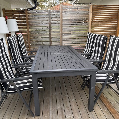 Lättskött och tålig matgrupp i svart med bord i aluminium och konstträ samt 8 stabila stolar i konstrotting. Dynor medföljer till stolarna.