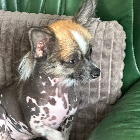 Lilla Bosse är en 3 åring hanhund som är kastrerad. Han är van vid andra hundar, katter och barn. Han älskar att gå ut och gå, vill vara med hela tiden. Han är inte van vid att vara själv hemma. Han är lite överviktig då han är en liten mattjuv. Han är en blandning av nakenhund/ pomeranien. Jag klipper ner honom i bland.