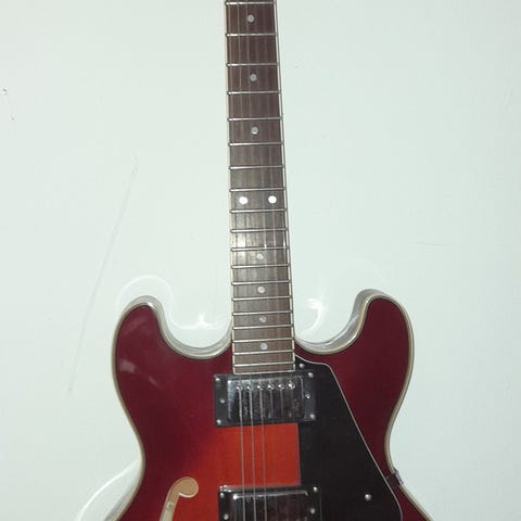 Klassisk Hondo Chiquita (modell CH-1BL), den legendariska rese-elgitarren från 80-talet som blev världsberömd genom sin design och koppling till populärkulturen.