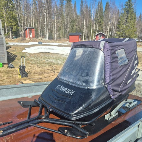 Brännapulka. Blekt kapell. Skidhållare. Ett par plastrutor är sönder. Ett renskinn medföljer pulkan. 9000:-