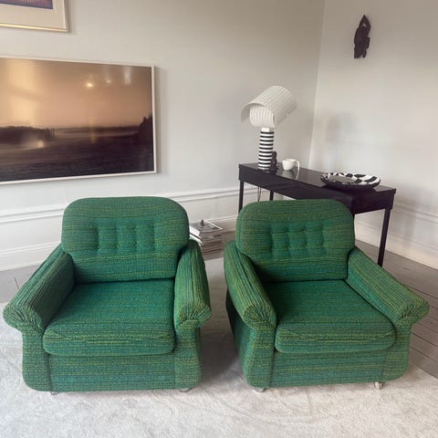 Två fina och supersköna fåtöljer som inte tar mycket plats. De är i mycket bra skick förutom de två mycket små fläckarna på ena fåtöljens armstöd.