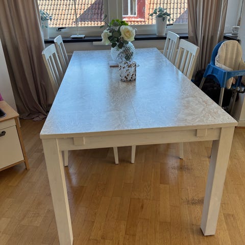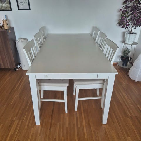 Matbord och 6 stolar i vitt.