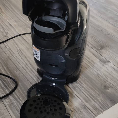 Bosch Tassimo kapselkaffemaskin i vitt med enkel knappstyrning på sidan. Avtagbart droppgaller och plats för mugg under brygghuvudet.