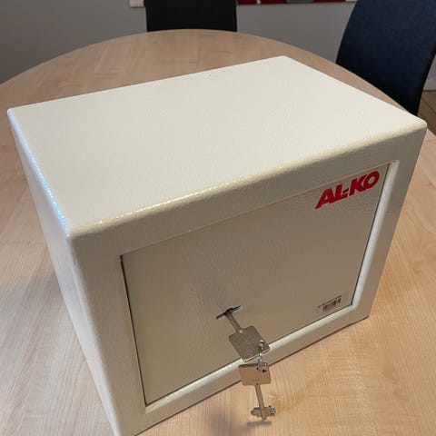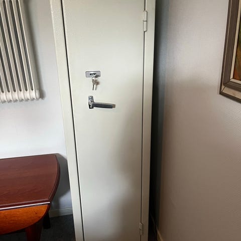 Ljusgrått säkerhetsskåp med flera flyttbara hyllor inuti. Låses med nyckellås och har rejält handtag på dörren.