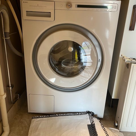 Asko frontmatad tvättmaskin med rund glaslucka framtill. Enkel panel upptill med fack för tvättmedel på vänster sida. 1600 varv centrifugering. Något rostig vid tvättmedelslucka