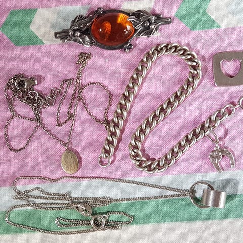 Gamla smycken i fint skick. Brosch, kedja med hänge och armring. Armringen är i barnstorlek.