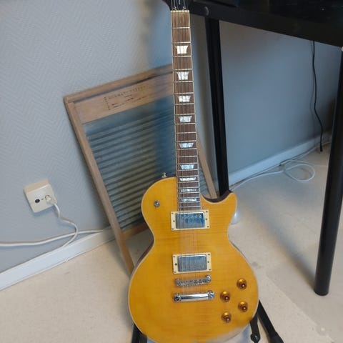 Detta är Pro-modellen med push/pull (coil-tap), vilket ger fler ljudmöjligheter än standardversionen. Gitarren har en snygg flame top och levererar klassisk Les Paul-ton – från varm clean till tyngre rock.
