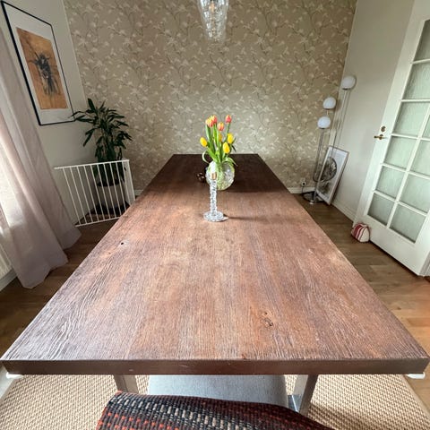 Stort matbord i furu med fyra stolar, rejäl stomme och kraftigt underrede. Bordsskivan har synlig trästruktur och raka kanter, passar bra om man vill ha gott om plats runt bordet.