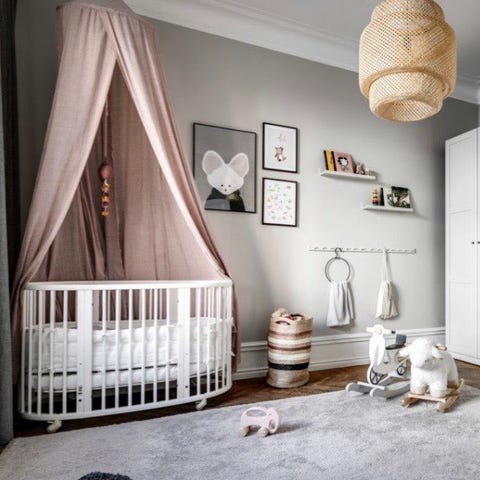 Vit oval spjälsäng från Stokke med ribbor runt om. Madrassen har ett mönstrat spjälskydd runt kanten.