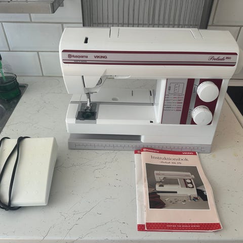 Janome Easy Jeans symaskin med flera olika sömmar och reglage på framsidan. Har inbyggt förvaringsfack för tillbehör och löstagbart hårt plastskal med handtag.