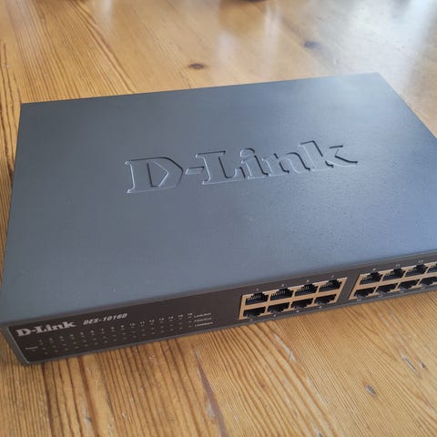D-Link nätverksswitch med 1+4 portar. Strömadapter med vanlig stickkontakt medföljer.
