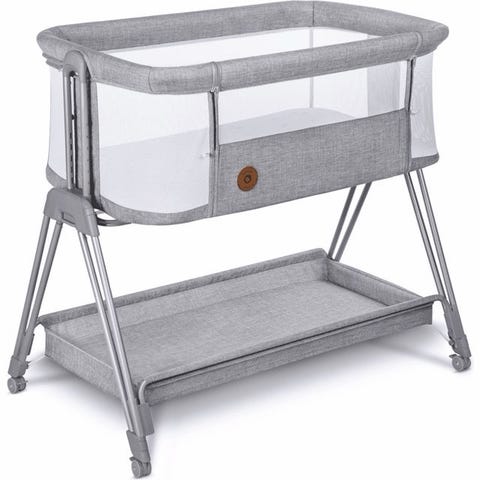 Meow bedside crib i rosa med justerbar metallstomme. Har nätpanel på sidan och hjul på benen för att kunna flyttas lätt. Sängen är isärplockad. Nypris var 1199.