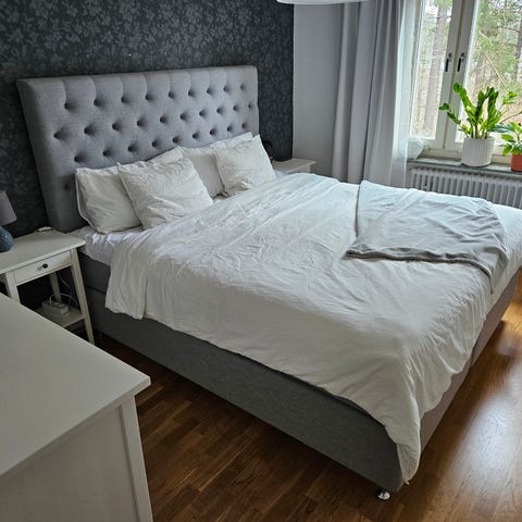 På grund av flytt upp till Norra Sverige säljer vi en kontinentalsäng i mörkgrått tyg med kromade ben. Två underdelar med gemensam bäddmadrass som ger en stor sovyta.