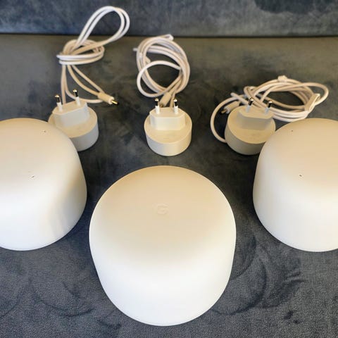 Google Wifi mesh-routrar i vitt, runda puckar med diskret design. Har nätverksportar och strömanslutning på undersidan samt QR-kod för enkel installation.